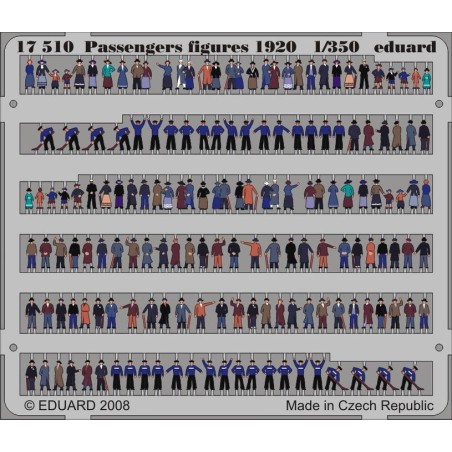 Set de figurines pré-peintes en photodécoupe, conçu pour animer les ponts des paquebots de l'époque, tels que le Titanic ou le Lusitania. Idéal pour les modélistes souhaitant ajouter du réalisme à leurs maquettes navales.