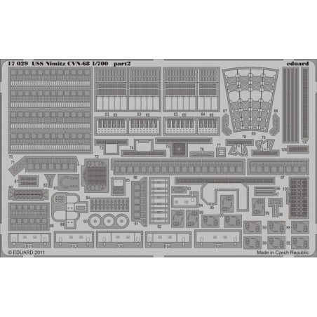 Kit de détails en laiton photodécoupé conçu pour le modèle Trumpeter du porte-avions USS Nimitz CVN-68 à l’échelle 1/700. Inclut rambardes, échelles, radars, passerelles et détails fins pour améliorer le niveau de détail du modèle.