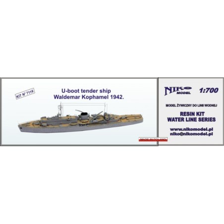 Reproduction du navire‑ravitailleur de sous‑marins allemand Waldemar Kophamel (classe Wilhelm Bauer) dans sa version de 1942. Maquette en résine à l’échelle 1/700.